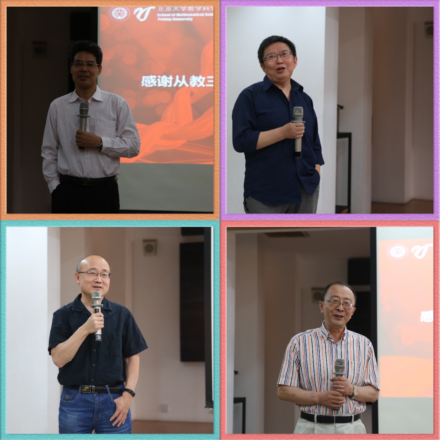 、领导、前辈老师的感谢之情。他谈及教学感悟,希望年轻的教师们能够多吸收国际上的教学经验,取长补短,以便更好地激发学生的好奇心以及学习劲头,为教学做出更多的成绩,培养更多一流的人才,为北大的双一流建设做贡献。田青春老师回忆起这三十年的峥嵘岁月——三十功名尘与土,八千里路云和月,表达了对丁先生的知遇之恩,让他能够在北大的舞台上拥有丰富的经历,他讲述了他给后辈写“爱自己,爱家人,爱单位,爱工作,爱集体”的心路历程,眉眼间流露出对后辈满满的希翼。王冠香老师回忆起弹指一挥间的岁月,表达了对学院的感谢之情和在北大的无悔岁月。