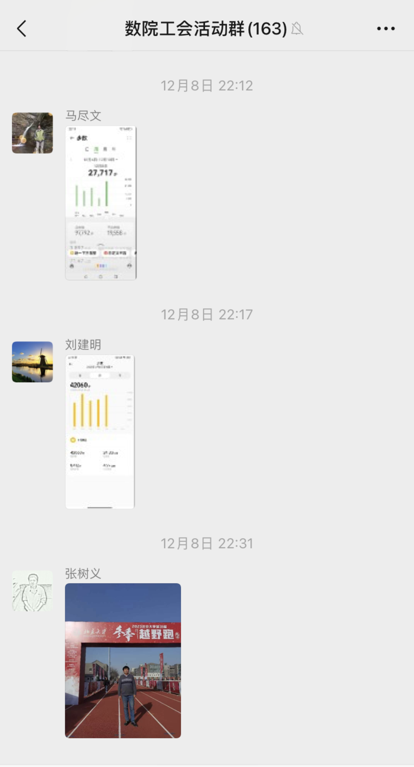 生命不息,运动不止。为了激发广大教职工的运动热情,促使大家树立“健康第一”的理念,数学科学学院工会在2023年的最后一个月例行开展运动月线上打卡活动。外出活动、每日健步走、燃烧卡路里的奔跑、每周羽毛球的比拼、每日乒乓球的切磋、优雅的瑜伽修行……这些都是学院工会会员的运动记录。学院工会鼓励大家积极投入“运动月”打卡活动,与大家分享运动的快乐与成果。无论是户外跑步、室内健身,还是团队运动,每一次记录都是对自己健康的一次投资。本次活动得到了学院100多名工会会员的踊跃参与,他们将运动的照片或者视频或者健身APP打卡等形式记录分享到“数院工会活动群”或者发送到工会邮箱。