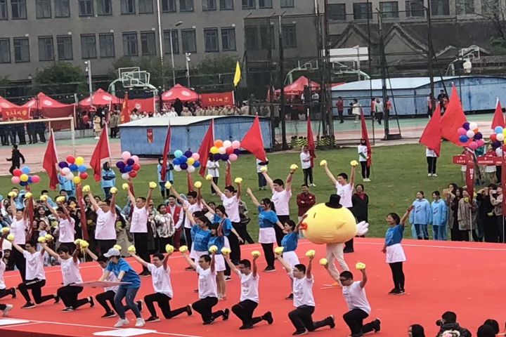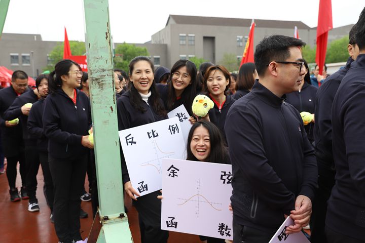 数学学院和数学中心的领导班子成员与教职工代表一起精神饱满地走向主席台,向全场观众展现了他们以逻辑测度时空,用脚步丈量天地的风采。从一次函数到三角函数,从反演变换到绝对值函数,北大数学人将书本真知化作身体力行,彰显着他们的无限创造与高涨热情。在舞台上,数学学院的男生整齐排成的坐标轴与女生形成的函数图像相映成趣。舞台中央可爱的吉祥物“识数鸡”,生动地展现了数学学子风采——独特,快乐,生动鲜活。老师们举着函数符号的牌子面向主席台,展现了他们用热情解析人生的形象。
