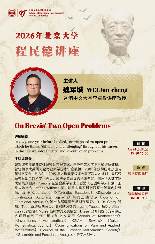 魏军城教授是非线性偏微分方程专家,香港中文大学李卓敏讲座教授。曾任加拿大英属哥伦比亚大学国家讲座教授,2010 年获得国家杰出青年科学基金(B 类),2015 年入选国家级海外高层次人才计划,先后荣获教育部自然科学一等奖、裘槎基金会优秀科研者奖、国际华人数学家大会晨兴银奖、Simons 基金会数学会士、香港杰出创科学人计划、加拿大数学会 Jeffery‑Williams 奖,加拿大皇家科学院院士等国内外殊荣。现任《Journal of Differential Equations》《Discrete and Continuous Dynamical Systems》共同主编以及《Journal of Functional Analysis》等十余部国际数学期刊编委。在 De Giorgi 猜想、Toda 系统解的分类、调和映照热流、Jaffe‑Taubes 猜想、Allen‑Cahn 方程有限 Morse 指标解的分类猜想、Brezis 公开问题等方向做出多项原创性工作,相关论文发表于《Annals of Mathematics》《Inventiones Mathematicae》《SIAM Review》《Duke Mathematical Journal》《Communications on Pure and Applied Mathematics》《Journal of the European Mathematical Society》《Geometric and Functional Analysis》等学术期刊。
