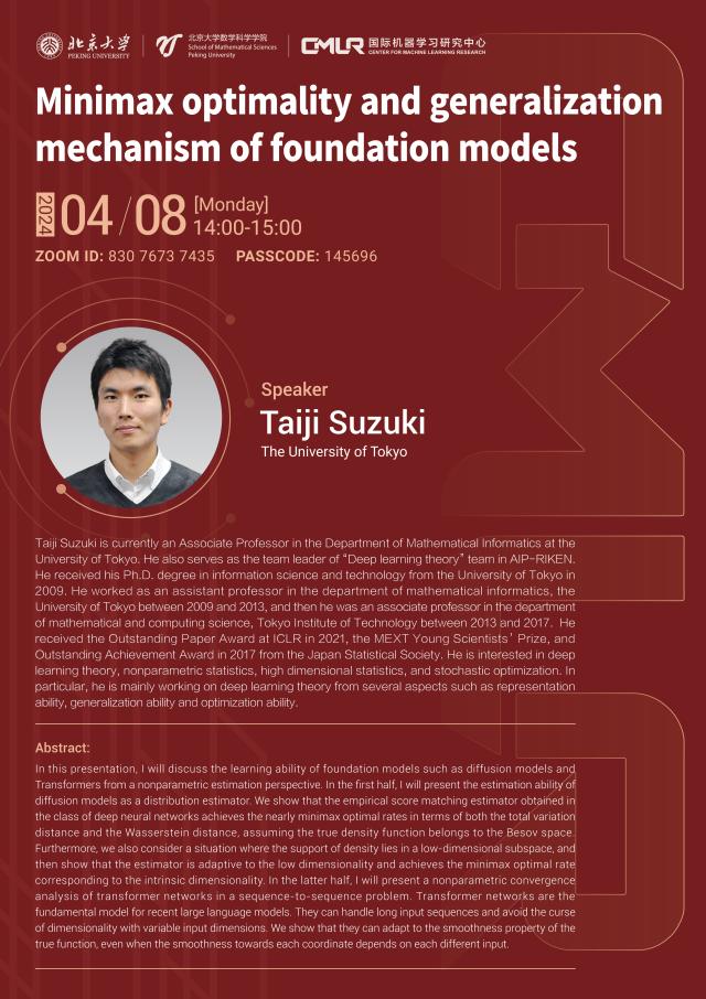 Taiji Suzuki is currently an Associate Professor in the Department of Mathematical Informatics at the University of Tokyo. He also serves as the team leader of “Deep learning theory” team in AIP-RIKEN. He received his Ph.D. degree in information science and technology from the University of Tokyo in 2009. He worked as an assistant professor in the department of mathematical informatics, the University of Tokyo between 2009 and 2013, and then he was an associate professor in the department of mathematical and computing science, Tokyo Institute of Technology between 2013 and 2017. He received the Outstanding Paper Award at ICLR in 2021, the MEXT Young Scientists’ Prize, and Outstanding Achievement Award in 2017 from the Japan Statistical Society. He is interested in deep learning theory, nonparametric statistics, high dimensional statistics, and stochastic optimization. In particular, he is mainly working on deep learning theory from several aspects such as representation ability, generalization ability and optimization ability.
