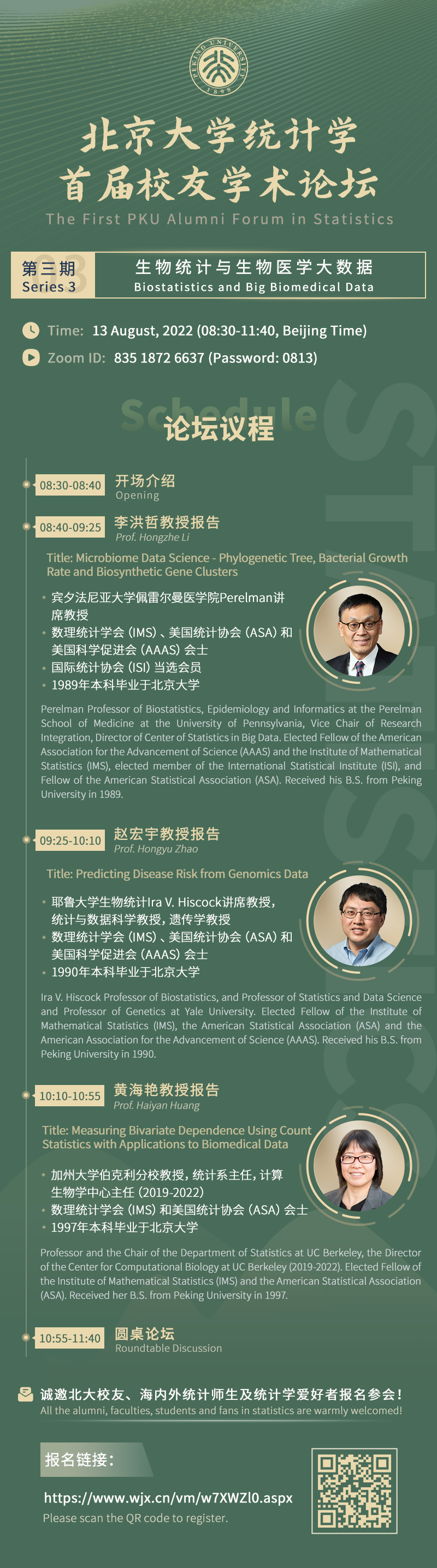 统计学首届校友学术论坛第三期将于北京时间2022年8月13日上午举行,主题是:“生物统计与生物医学大数据” (Biostatistics and Big Biomedical Data)。本期将邀请宾夕法尼亚大学李洪哲教授、耶鲁大学赵宏宇教授、 加州大学伯克利分校黄海艳教授三位校友作报告分享,之后进行圆桌讨论。根据疫情防控要求,本期论坛将继续采用Zoom线上会议形式进行。