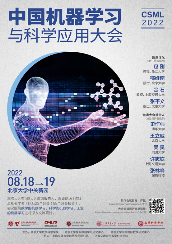 中关新园召开。本次大会有5位大会邀请报告人,圆桌论坛(院士及知名学者)以及四个分会(98个分会报告)。会议围绕数学的机器学习、科学的机器学习、工业的机器学习进行深入交流研讨。欢迎相关领域的专家学者、青年教师、学生以及工业界的专家、专业技术人员等参加本次会议。