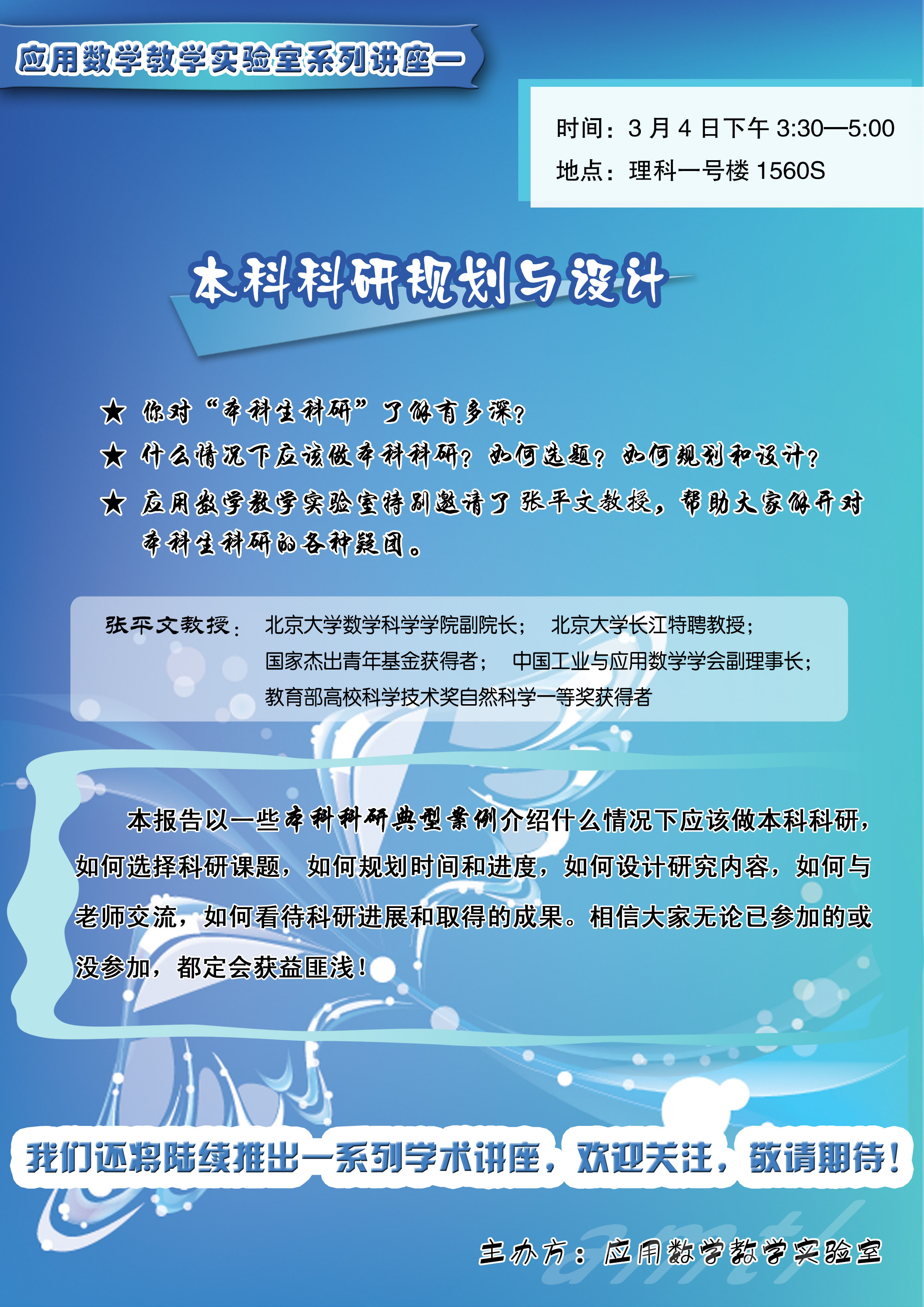 应用数学教学实验室特别邀请了张平文教授,帮助大家一一解开对本科生科研的各种疑团。