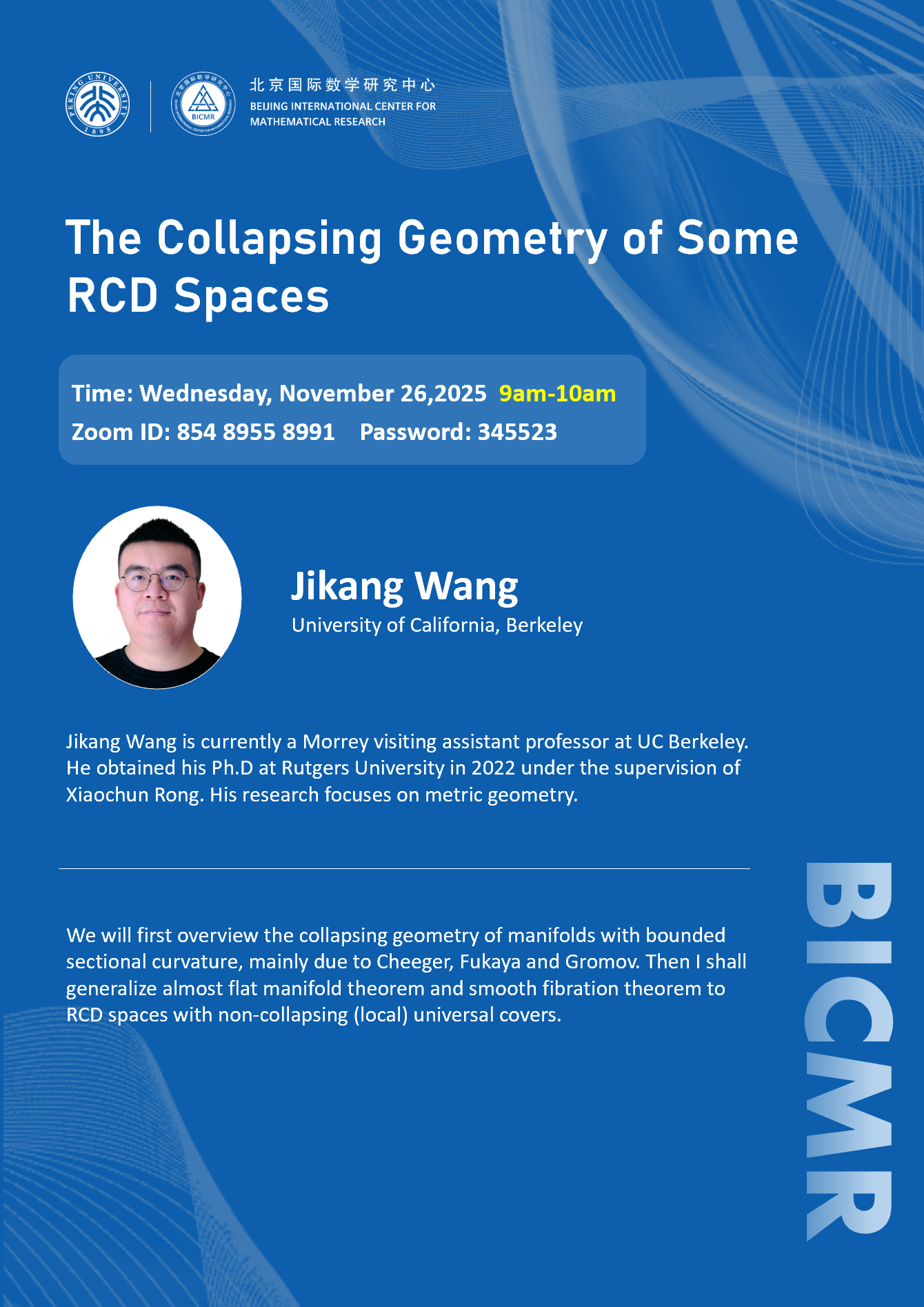 Jikang Wang is currently a Morrey visiting assistant professor at UC Berkeley. He obtained his Ph.D at Rutgers University in 2022 under the supervision of Xiaochun Rong. His research focuses on metric geometry.