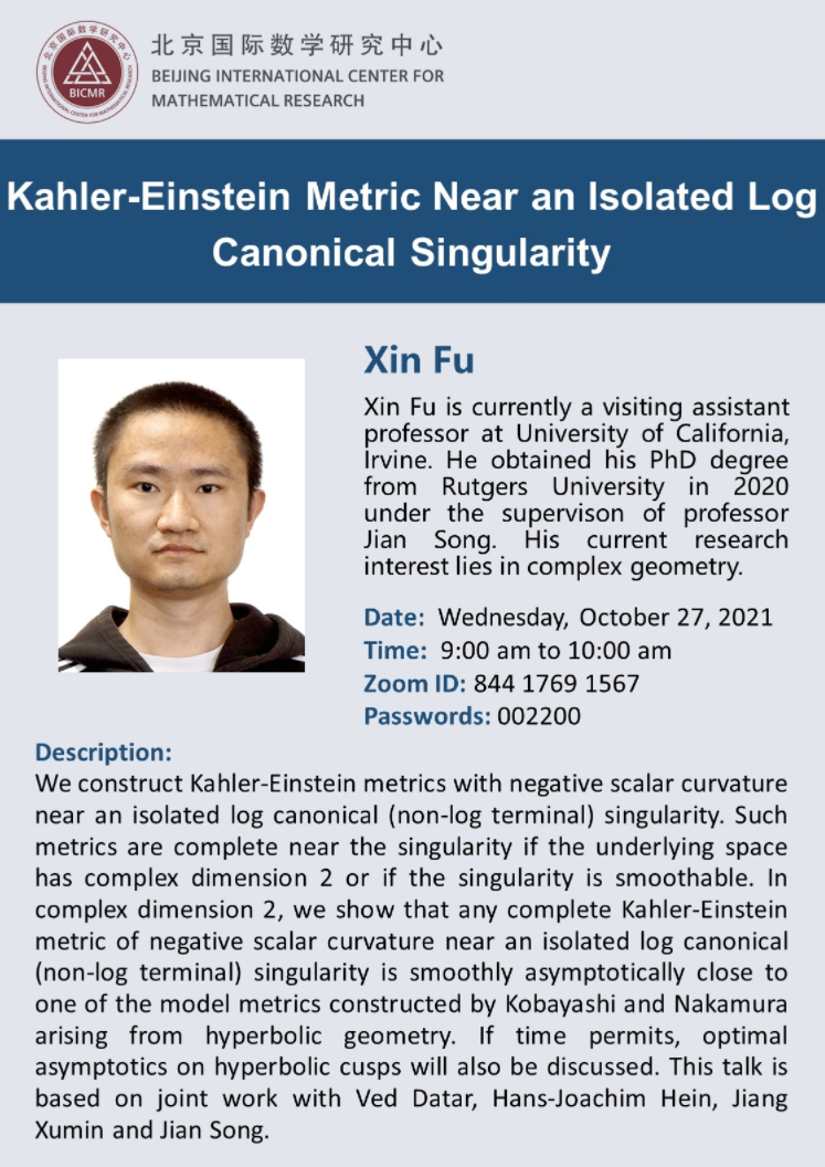 Speaker: Xin Fu is currently a visiting assistant professor at University of California, Irvine. He obtained his PhD degree from Rutgers University in 2020 under the supervison of professor Jian Song. His current research interest lies in complex geometry.