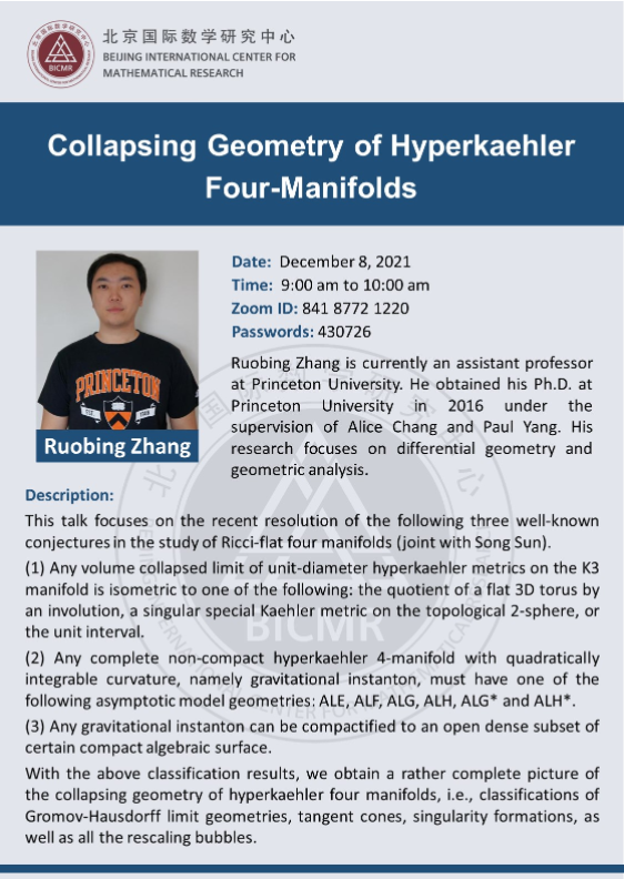 Ruobing Zhang is currently an assistant professor at Princeton University. He obtained his Ph.D. at Princeton University in 2016 under the supervision of Alice Chang and Paul Yang. His research focuses on differential geometry and geometric analysis.