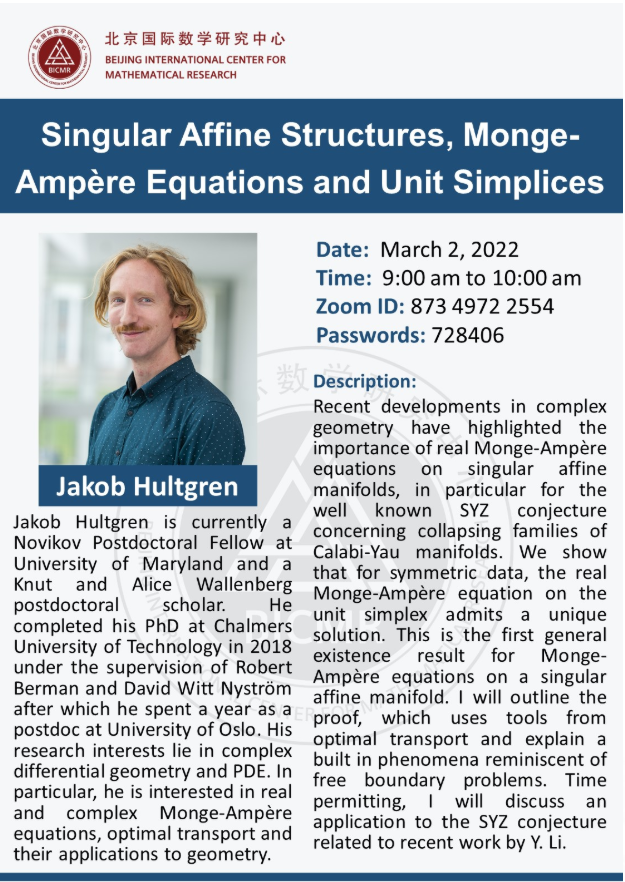 Jakob Hultgren is currently a Novikov Postdoctoral Fellow at University of Maryland and a Knut and Alice Wallenberg postdoctoral scholar. He completed his PhD at Chalmers University of Technology in 2018 under the supervision of Robert Berman and David Witt Nyström after which he spent a year as a postdoc at University of Oslo. His research interests lie in complex differential geometry and PDE. In particular, he is interested in real and complex Monge-Ampère equations, optimal transport and their applications to geometry.