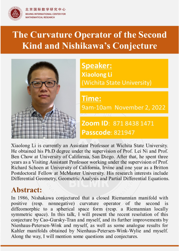 Xiaolong Li is currently an Assistant Professor at Wichita State University. He obtained his Ph.D degree under the supervision of Prof. Lei Ni and Prof. Ben Chow at University of California, San Diego. After that, he spent three years as a Visiting Assistant Professor working under the supervision of Prof. Richard Schoen at University of California, Irvine and one year as a Britton Postdoctoral Fellow at McMaster University. His research interests include Differential Geometry, Geometric Analysis and Partial Differential Equations.