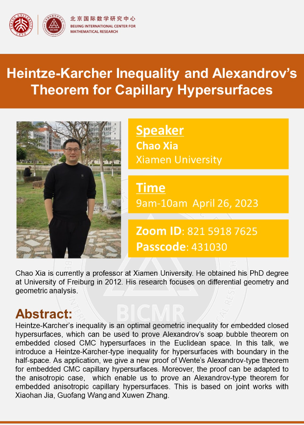 Speaker: Chao Xia is currently a professor at Xiamen University. He obtained his PhD degree at University of Freiburg in 2012. His research focuses on differential geometry and geometric analysis.