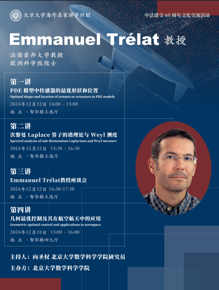 报告人信息:Emmanuel Trélat is full professor at Sorbonne Université and is the director of Laboratoire Jacques-Louis Lions. He is the Editor in Chief of the journal ESAIM: Control Calc. Var. Optim. and is Associate Editor of several other journals, including SIAM Review. He has been awarded a number of prizes, among which the Felix Klein Prize in 2012, and an invited speaker invitation to ICM in 2018. He is also a member of Academia Europaea. His research interests range over control theory in finite and infinite dimension, optimal control, stabilization, geometry, numerical analysis. He also collaborates with industrials, for example he is the inventor of the software that is used for the control guidance of the Ariane launchers.