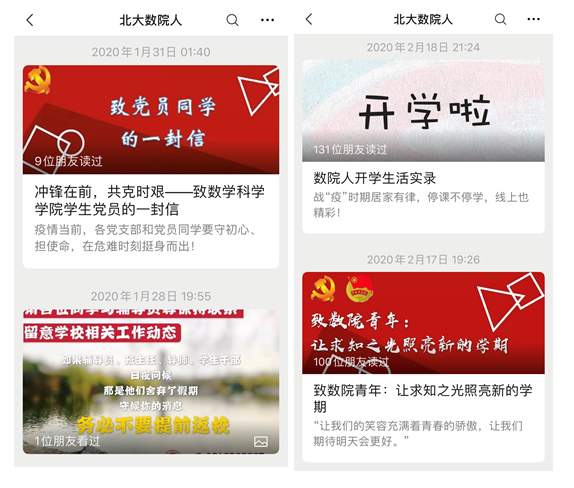 停课不停组织建设,不停思想引领,创新“云”思路。疫情爆发后,院学工办、团委第一时间组织学生骨干召开疫情防控时期工作讨论会,各团学组织利用“北大数院人”、“数院学生会”、“数院研究生会”三个公众平台做好疫情防控思想引领和科普宣传工作,以“防疫数递”、“防疫科普”、“战疫有我”、“数研防疫”四个特别栏目,推进党团指导、信息畅通、科普防疫、学研督导,1月23日至今各团学组织推出党团致信、防疫科普、教学选课等相关推送27篇。学生会组织学生进行线上教学调研,经讲授老师同意在bilibili网站整合“数学一小时”学术资源,响应停课不停学的倡导。此外,通过学工办集中组织和动员党团班力量,开展元宵佳节征集活动、主题党日、主题团日和主题班团活动,有效凝聚在湖北、在学校和在全国各地的同学,在疫情防控的特殊时期凝聚起学院师生的温暖情谊和必胜信心。