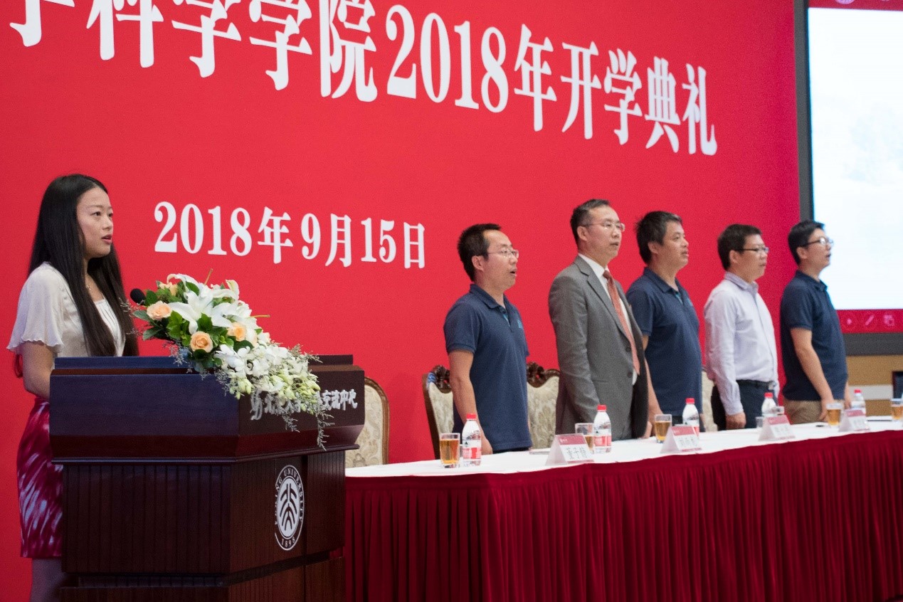 2018级本科生王艺纯、博士生刘子愉,分别作为本科生和研究生新生代表发言。王艺纯在发言中回顾了她与北大结缘的渊源,从神往北大的游客到参加数学与科学学院夏令营的营员,再到圆梦北大的新生,她表示愿与同学们共同留下青春记忆,在追随最前沿学科领域的旅程中传承北大精神。刘子愉则以“我们为什么在北大读研”作为开场白,表达了对燕园生活的设想与期待,在他看来这里除却五彩缤纷色彩斑斓的土壤,更有同窗间的切磋碰撞,除却学术研究的抱负,还有改变世界的理想。