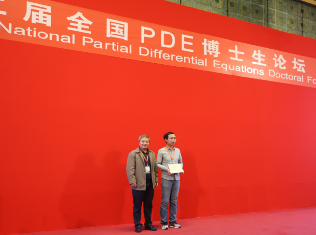 全国偏微分方程优秀博士论文奖获得者蔡圆(香港科技大学);优秀博士论文提名奖获得者陈洪葛(武汉大学)、曹蕾(河南大学)、刘彦麟(中国科学技术大学)、韦韡(复旦大学)分别上台领奖。