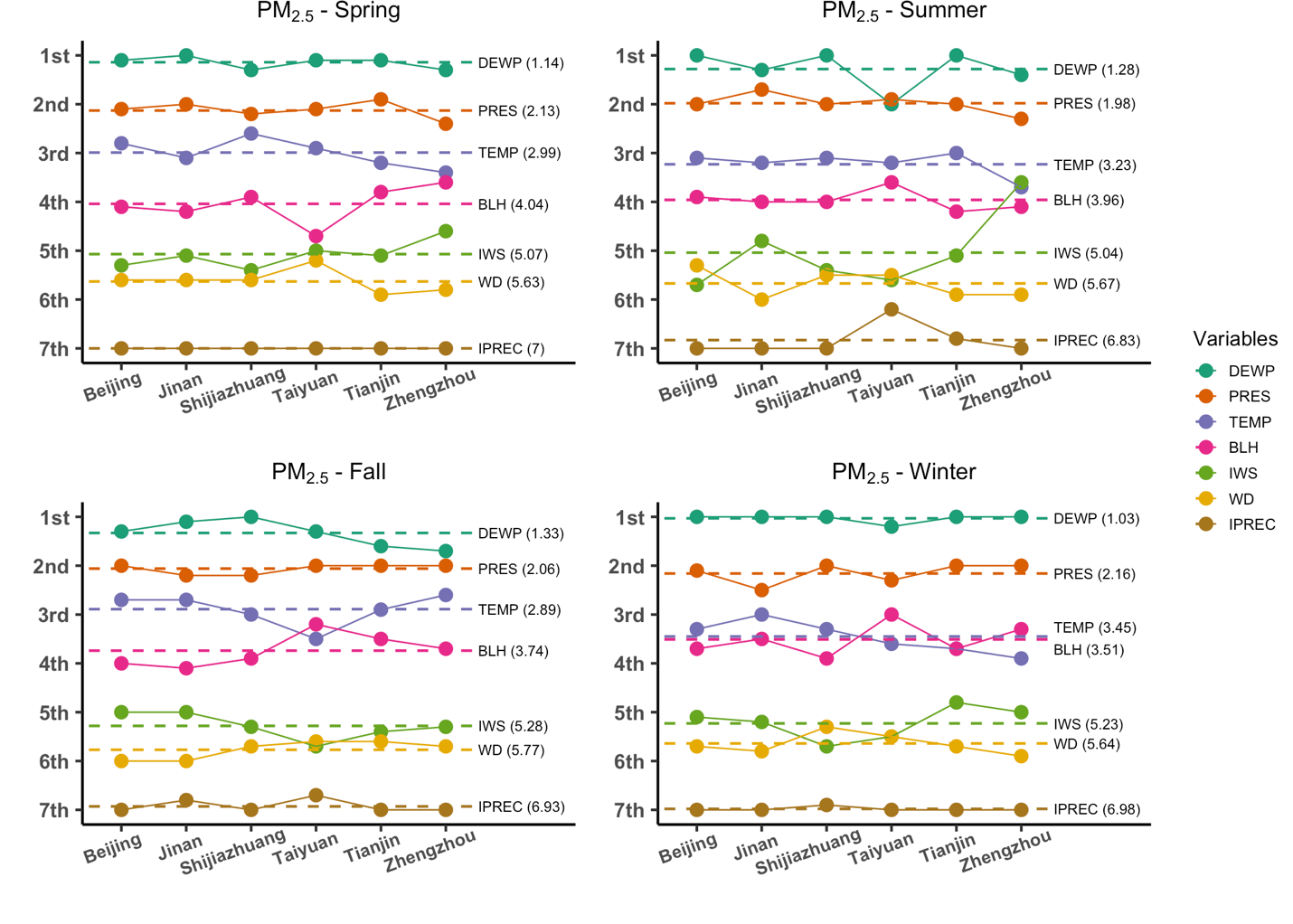 六城市2013-2020年对PM2.5非参数回归建模中气象变量重要性排序的季节平均。不同颜色的点代表不同气象变量在该城市该季节的排序平均值,水平虚线标出了六个城市的平均水平。