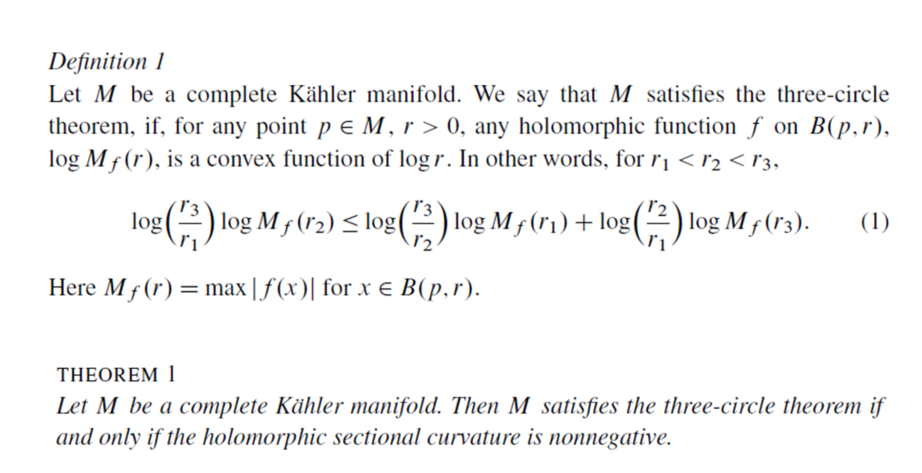 后来导师建议我研究单值化猜想。之前已经有了许多工作,但是我查看之后发现自己取得突破的可能不大,所以暂时搁置了。后来,在考虑一个全纯函数的Liouville问题时,我用了Li-Wang的一个比较定理,得到了一个非常简短的证明。后来发现,这个思路可以推广一下,得到Kähler流形上的一个三环定理。