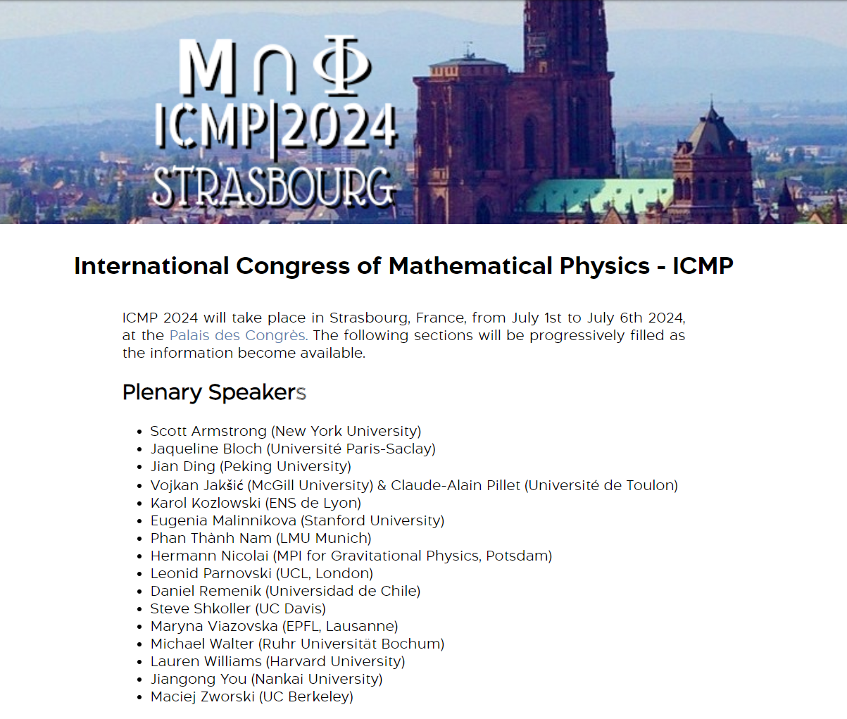 国际数学物理大会(International Congress of Mathematical Physics简称ICMP)1972年首次在莫斯科举办,1988年以来ICMP每3年举办一次,是国际数学物理联盟(International Association of Mathematical Physics)主办的最重要的数学物理领域的国际会议。2024年度国际数学物理大会(ICMP2024)将在法国城市斯特拉斯堡召开,往届大会报告人包括了菲尔兹奖、诺贝尔奖得主等许多著名数学家和物理学家。详见//icmp2024.org和//iamp.org