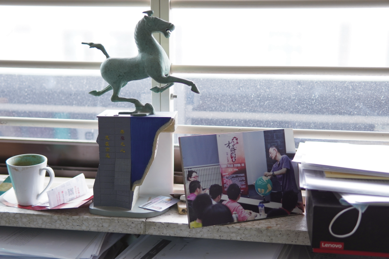 因此,房间里也没有太多“历史的遗留”——四块黑板占据了整个墙面,与另一面墙上的世界地图、登山杖和草帽草鞋对视;更小的角落里,比王诗宬高不到半米的书柜静静站立。