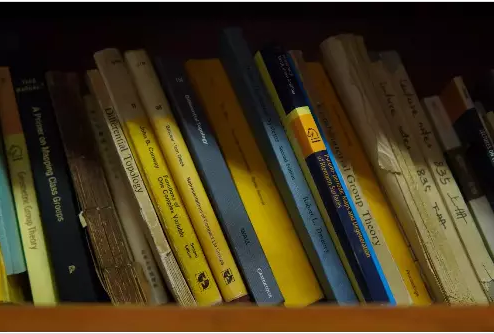 书不多,也大多是数学相关的读物,尤其是拓扑学的内容。王诗宬没有什么藏书的习惯,甚至直言自己并“不爱书”,书册大多是随手捡来、随手翻看,阅毕了再随手一扔,下次捞到时再看看,但还是有很多专业书被有序地码在书架上。版本一变再变,王诗宬也从姜伯驹先生口中“小青年”变成了学生们的“爷爷”。