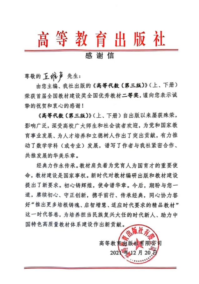 《高等代数》(上下册)荣获首届全国教材建设奖全国优秀教材二等奖