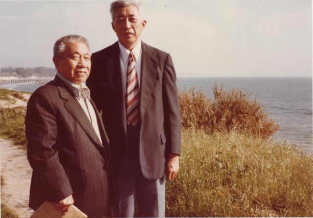 1983年12月,丁石孙(右)与樊畿在圣塔芭芭拉太平洋边合影