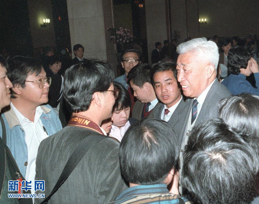 1990年3月18日,全国政协七届三次会议在北京人民大会堂开幕。这是丁石孙同志在大会休息厅接受记者采访。 新华社记者 马俊田 摄